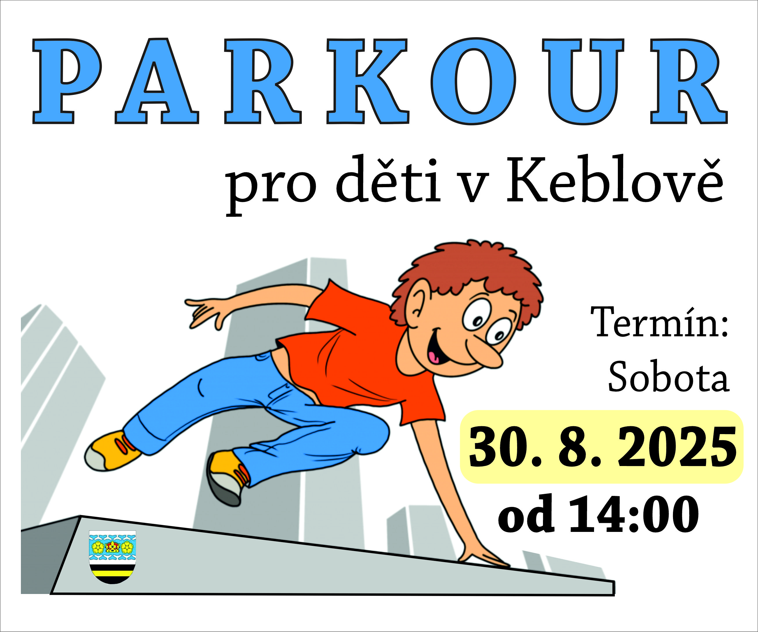 v sobotu 30.8. od 14.00 hodin u obecního úřadu. Nejdříve ukázka a poté cvičení s dětmi a možnost parkour si vyzkoušet. Součástí bude občerstvení z Foodtrucku.